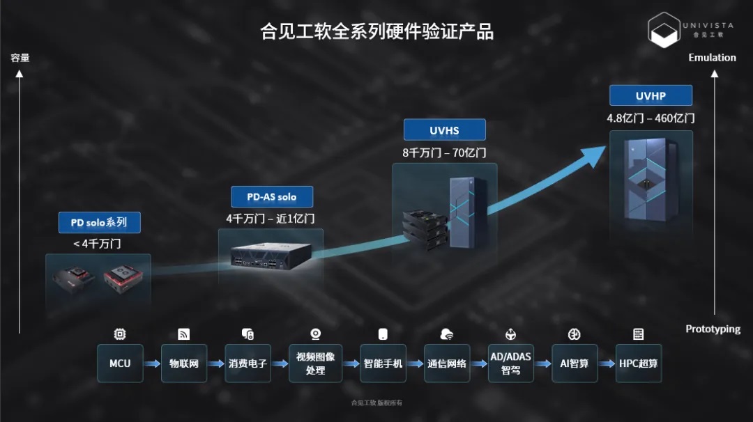 以合見工軟的數(shù)字驗(yàn)證硬件平臺來看,自成立以來歷經(jīng)了多代產(chǎn)品的演進(jìn)與迭代,現(xiàn)如今已具備完整的全系列硬件驗(yàn)證產(chǎn)品線,包括了針對中小規(guī)模原型驗(yàn)證的Phine Design 系列(PD SOLO)、搭載AMD新一代Versal™ Premium VP1902 的單系統(tǒng)先進(jìn)原型驗(yàn)證平臺PHINE DESIGN Advanced Solo Prototyping(簡稱“PD-AS”)、適用于大規(guī)模ASIC/SOC 軟硬件驗(yàn)證的全場景驗(yàn)證硬件系統(tǒng)UVHS、以及數(shù)據(jù)中心級超大容量硬件仿真加速驗(yàn)證平臺UVHP系列,產(chǎn)品全線覆蓋了從4千萬到460億邏輯門級別的原型驗(yàn)證及硬件仿真,可廣泛應(yīng)用于MCU、物聯(lián)網(wǎng)、消費(fèi)電子、視頻圖像處理、智能手機(jī)、通信網(wǎng)絡(luò)、AD/ADAS智駕、AI智算、HPC超算等領(lǐng)域。