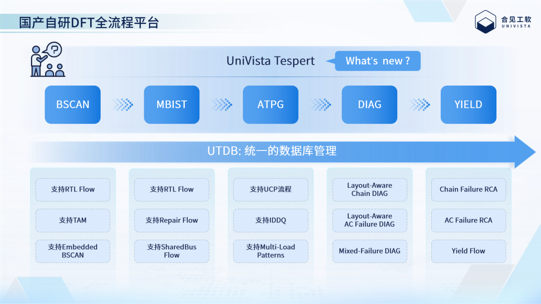 可測性設(shè)計(jì)(DFT)全流程平臺UniVista Tespert是合見工軟更廣泛的數(shù)字實(shí)現(xiàn)EDA產(chǎn)品組合的重要產(chǎn)品之一。該平臺集成一系列高效工具,其中包括:邊界掃描測試軟件工具UniVista Tespert BSCAN、存儲單元內(nèi)建自測試軟件工具UniVista Tespert MBIST、測試向量自動生成工具UniVista Tespert ATPG、缺陷診斷軟件工具UniVista Tespert DIAG、良率分析工具UniVista Tespert YIELD。