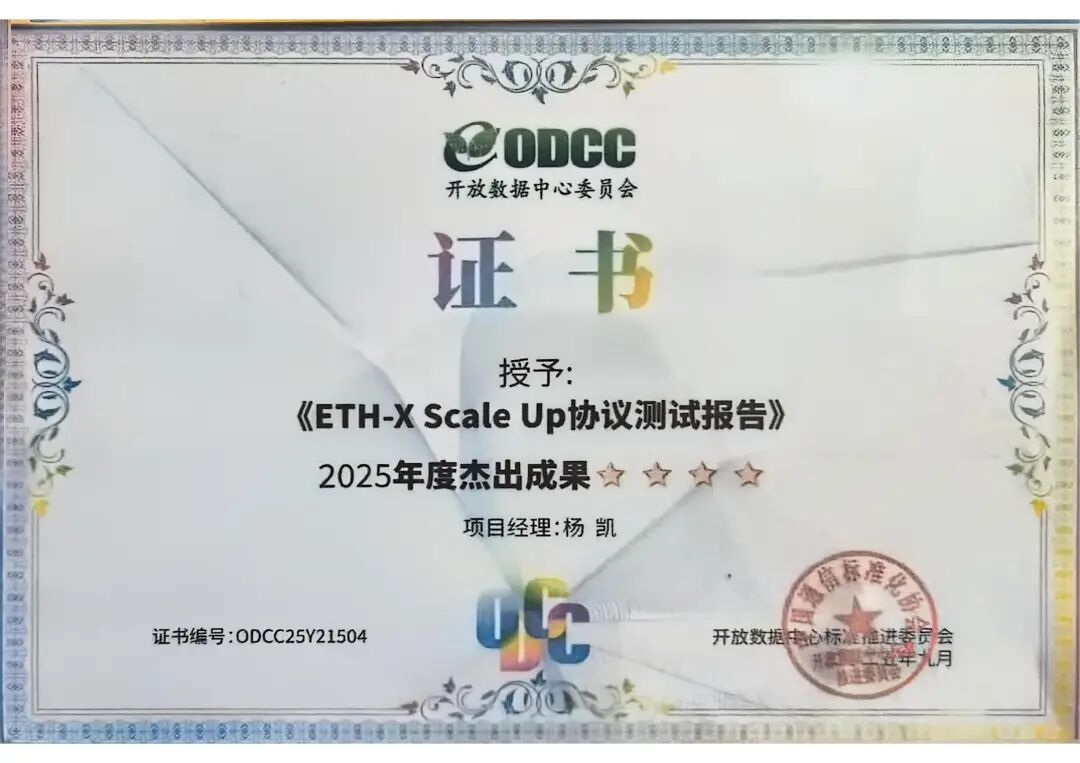 在2025年9月舉辦的ODCC年會(huì)上,合見工軟發(fā)布了首份AI網(wǎng)絡(luò)聯(lián)合實(shí)驗(yàn)室針對(duì)ETH-X scale-up協(xié)議組網(wǎng)的測(cè)試報(bào)告,這一重要成果在會(huì)上獲得了業(yè)界高度認(rèn)可,并被開放數(shù)據(jù)中心標(biāo)準(zhǔn)推進(jìn)委員會(huì)授予“2025年度杰出成果證書”,標(biāo)志著合見工軟在國(guó)內(nèi)高性能AI網(wǎng)絡(luò)領(lǐng)域的突破性進(jìn)展。
